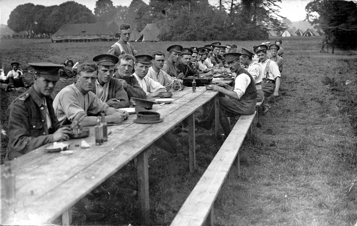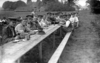 Hardwick House was not totally commandeered for use by troops, and continued to be the home of George Gery Milner-Gibson-Cullum. The grounds of Hardwick House were used for training purposes, and the front lawns turned into hay meadows for forage for horses and other animals. Other parts of the estate were farmed for food. Members of the Signals Regiment seem to have been based at Hardwick, and wounded soldiers were often entertained there on days out from Hengrave Hall Hospital. Cullum allowed convalescent troops to wander in the grounds of Hardwick House and often invited parties over for tea, as seen here.