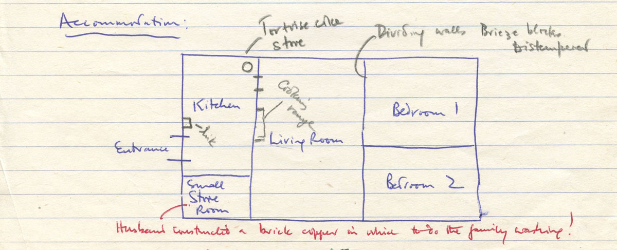 This sketch was drawn by Frank Whitnall from descriptions taken in March, 1996, from Mrs Peggy Clarke, resident from December 1948, when they were one of the first "official" tenants. They stayed until 1951, when they moved to a council pre-fab in Priors Road.