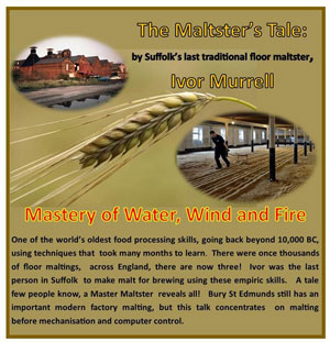 I was scheduled to give an hour lecture for the Bury Past and Present Society in the Guildhall on November 2nd 2020 (Covid safety arrangements permitting) where you could see over 100 images in my PowerPoint presentation of traditional floor malting, and with due reference to Gough's maltings. (This talk eventually took place on Monday 3rd October, 2022). I don’t take up many requests to speak, but I was particularly keen to deliver this talk in Bury. See below the note I sent to Bury Past and Present Society. I have given various versions of the talk to other Suffolk towns that had floor maltings. I do this whilst I am still able and the talk attracts a lot of interest --- so much has been forgotten. I call one version of my talk ‘The Art and Mystery of Malting’.
