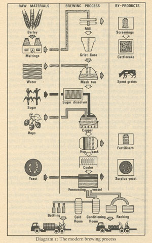At the brewery the malt is milled and ground down into grist, ready for mixing with water, which is known throughout the brewing process as liquor. Hot liquor and grist mix either in the mash tun - a large, cylindrical vessel - or in a mashing machine (masher) which opens out into the tun. The thick, sludgy mix is then allowed to stand for two or three hours at a controlled temperature.
