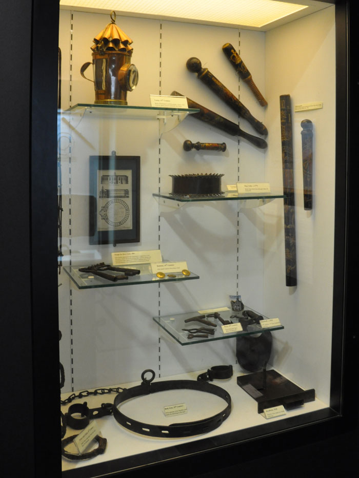 A cell door, some stocks and a man trap illustrate the hazards of a criminal career. |