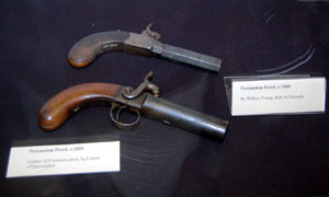 The lower pistol to the left is a .620 calibre boxlock by Colson of Stowmarket, dated 1850. The upper percussion pistol is by William Young of Bury, dated c1840. |