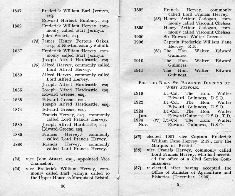 In 1680 the free Burgesses of Bury asserted that the election of Sir Thomas Hervey and Thomas Jermyn as MP's for Bury was wrongly conducted. They said that as the major part of the free burgesses wanted Sir Thomas Cullum and John Rotherham, the Alderman was wrong to return Hervey and Jermyn. It was judged that the electorate was the Alderman, 12 capital burgesses and 24 burgesses of the common council. The Freemen of the town had no vote in the matter.
