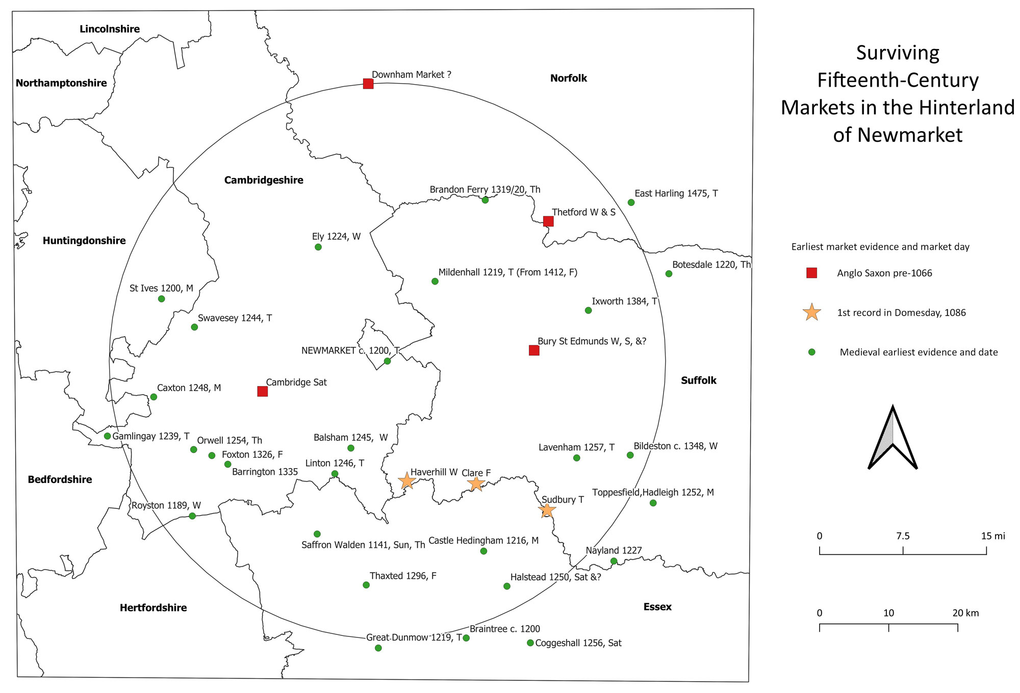 Newmarket and other markets within 25 miles radius. Newmarket's ambiguous location along county boundaries helped to keep it out of the hands of the Abbot of Bury. By the 15th century Mildenhall market never repaid the abbot's investments as might have been expected, while Newmarket continued to flourish.