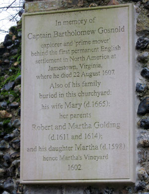 Bartholomew Gosnold A modern plaque from 2007 Plaque located on Chapel of the Charnel in the Great Churchyard |
