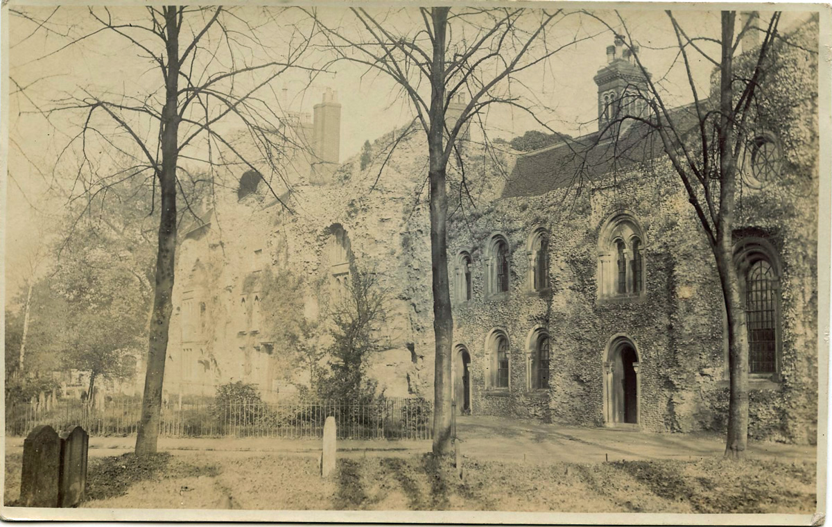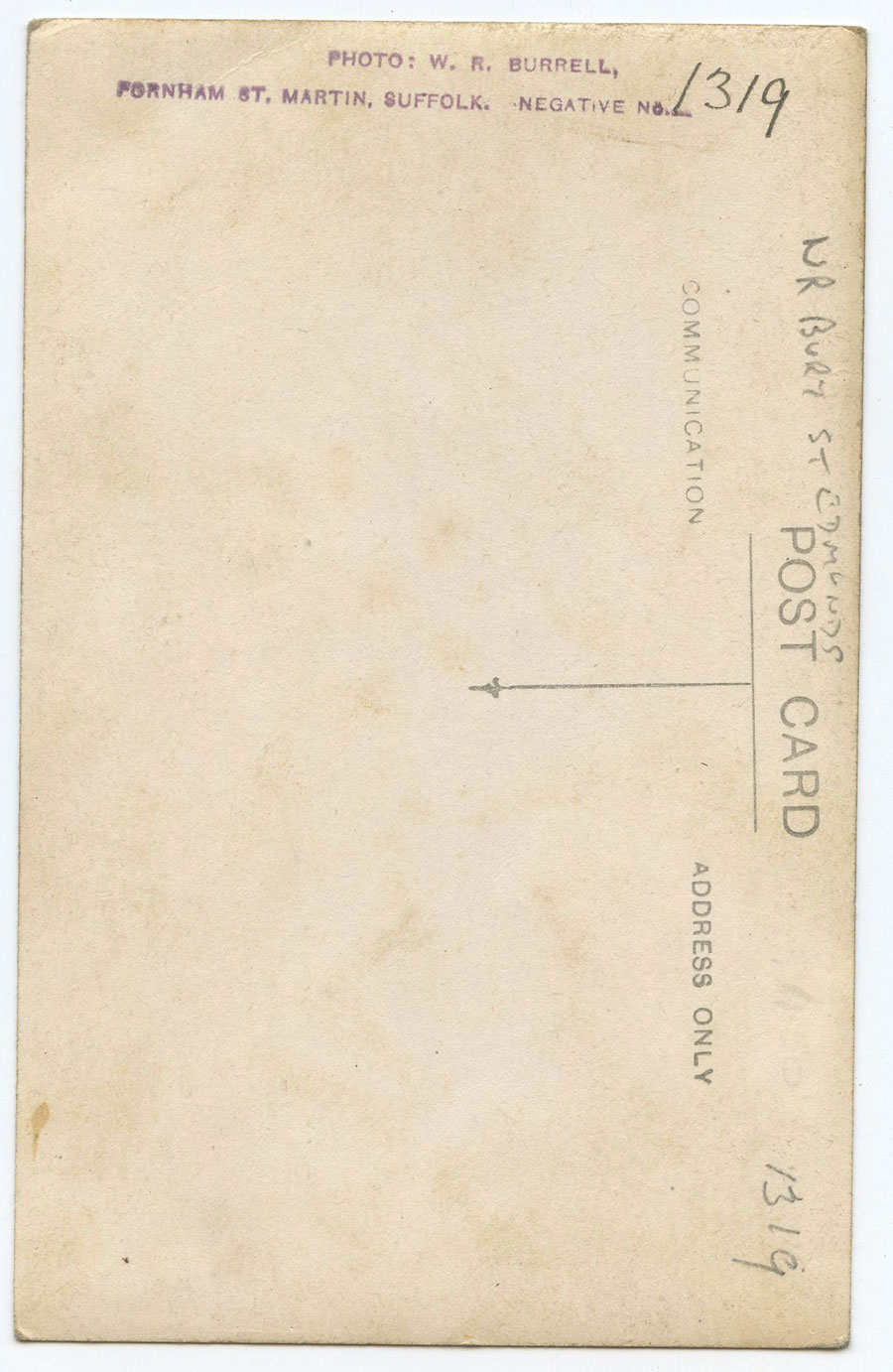 After the 1902 postcard reforms the earliest Walton Burrell postcard that is both dated and unequivocally attributable to him is this view of the West Front of the Abbey ruins in Bury St Edmunds. The reverse also shows that Burrell was actively selling these cards in a commercial manner. He is writing to the Reverend Lord Charles E Fitzroy, at Euston Rectory, on Boxing Day, 1905, thanking him for his postal order, and promising to send him a dozen views shortly.