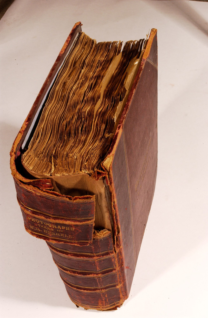 The original binding must have been professionally done, as shown by the picture here, and the gold leaf lettering on the spine, saying, "Photographs taken by W R Burrell."