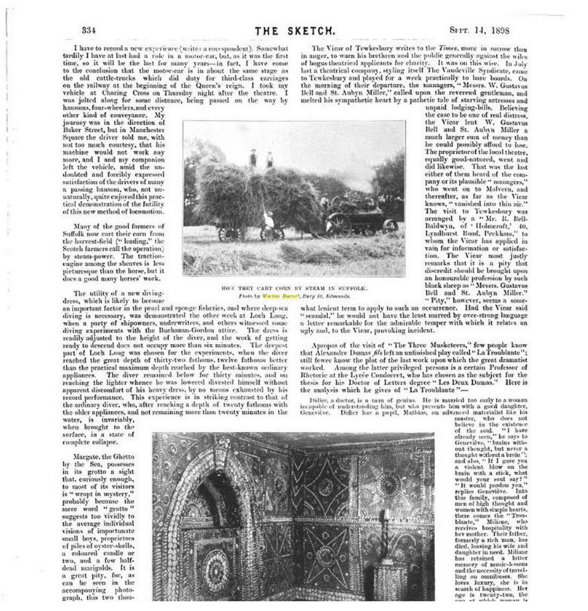 In the Sketch newspaper of September 14th 1898, Burrell had one of his pictures published to illustrate an article written on the vagaries of the motor car and modern transport methods. The picture is labelled "How they cart corn by steam in Suffolk. Picture by Walton Burrell Bury St Edmunds." The writer continues, "The traction engine among the sheaves is less picturesque than the horse, but it does a good many horses' work."
