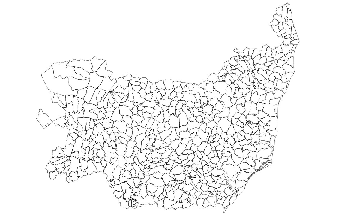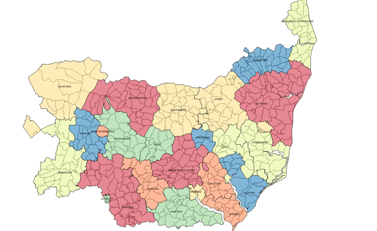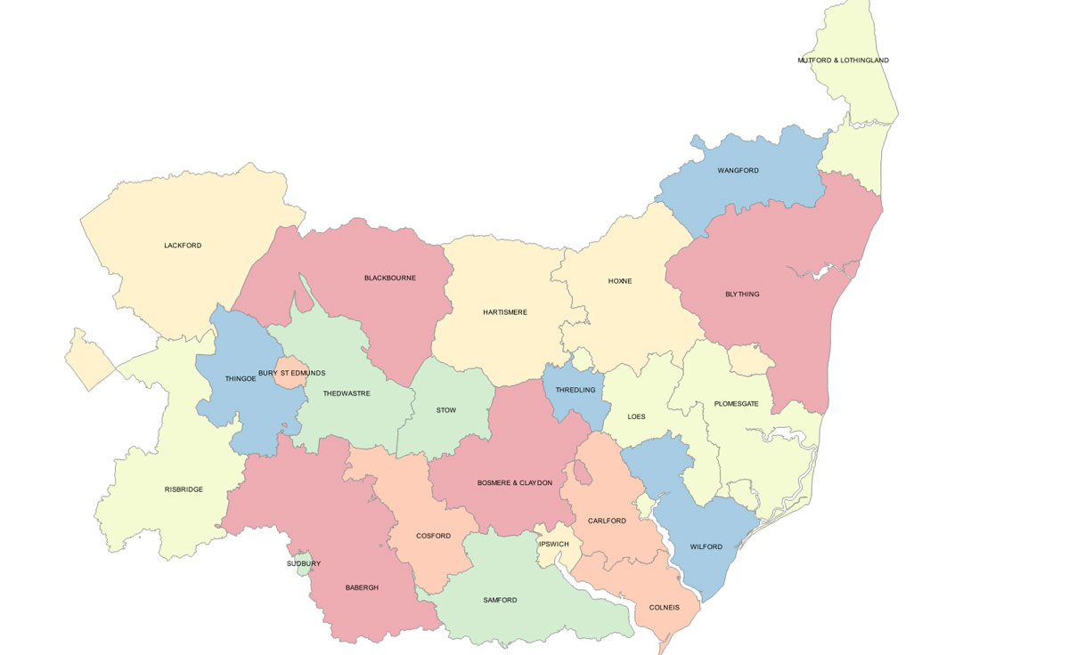 This example of a map produced within QGIS shows the area of the county of Suffolk as it was in the mid 19th century. The parish boundaries are shown, and the styling of the layer has been changed to make each parish have what is called a 'transparent fill'. This is achieved by clicking on the layer name to open the layer properties dialogue. Open the tab marked 'Style'. Click on the small coloured box labelled 'Simple fill'. This opens a new view. Look for 'Colors Fill' which also contains the fill colour, but now clicking on the drop down menu produces a list of possible colours, but also allows you to select' Transparent Fill'.