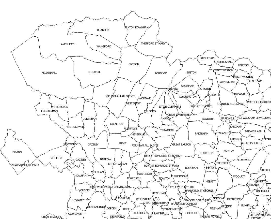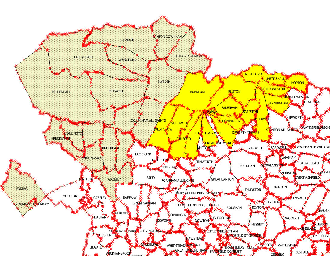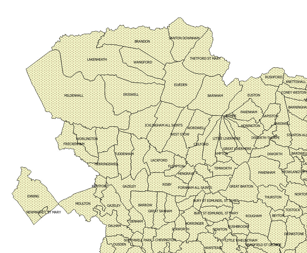 We now see the effect of this manoeuvre. The already processed Hundred of Lackford is shaded with dots showing through from the copy layer. Meanwhile the picture shows the effect of the partly selected Hundred of Blackbourne in progress on the parish layer.