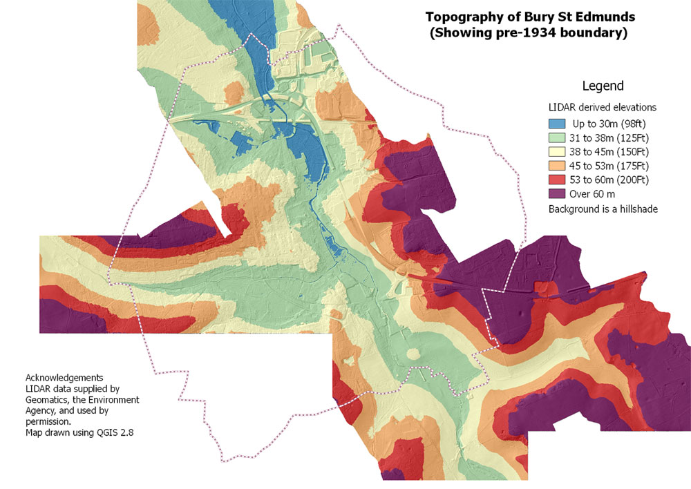 This example of a map produced within QGIS demonstrates some of the power of using LIDAR imaging, but also some of the difficulties, the most prominent of which is the current restriction of data to the river valleys. This leaves areas of Bury St Edmunds not covered by this method.