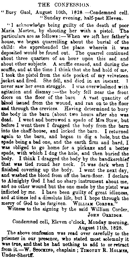 Before and during the trial, Corder had maintained his innocence. He was now encouraged - for the good of his soul - to confess his guilt. Over the next two days, John Orridge the Prison Governor, and the Reverend W. Stocking, the Prison Chaplain (whom Curtis described as "feelingly alive for the spiritual welfare of the prisoner") spent long hours with Corder, talking about the crime and the burden on his conscience. Corder spent the night after his trial in fitful sleep. He was woken at six the next morning by a visit from the Reverend Mr. Stocking who stayed for two hours. Corder worried about confessing, and the further disgrace and distress exposure of his lifetime's wrong-doings to public view would cause his family. Adding to their woes could be of no benefit to his soul. In a conversation with Orridge he said that confession to God was all that was necessary, that confession to man was Popedom or Popery and he would never do it. Even in extremis, Corder's secretive nature remained strong. The thought of anatomisation also preyed on his mind: while talking with Orridge about Maria's burial, he exclaimed "O, God! nobody will dig my grave!" On Saturday afternoon Corder's wife was allowed to visit for half an hour. Their meeting was tearful on both sides. Mrs. Corder, a woman of strong faith, urged her husband to repent and to prepare to account for himself before God. Her words had great effect, and he immersed himself in a religious book which she gave him. During the course of the day he attended the chapel. Mr. Stocking's discourse upon the Last Judgement made a deep impression. Stocking spent much of the day until late in the evening with Corder. The High Sheriff's chaplain, the Rev. Mr. Sheen also visited for half an hour, and in forcible language zealously exhorted the condemned man to repent and take refuge in the Gospel. While Corder was suffering these torments of conscience, work was afoot to prepare the scaffold. At Bury the scaffold was usually erected in the middle of a paddock on the NE side of the gaol. To reach it, condemned criminals were taken through the front door of the prison and along the road. The large crowd expected for Corder's execution would make this impossible. Instead, an opening , afterwards known as "Corder's Door," was made in the wall between the paddock and the gaol, and the scaffold erected next to it. Corder was informed of this arrangement. He appreciated that he would not have to pass through the yelling crowds. On Sunday morning Corder attended the service in the prison chapel. Mr. Orridge allowed the press to attend. After the other prisoners had taken their places and Mr. Stocking was ready, Corder was brought in and conducted by the Governor to the condemned pew. He sat in a posture he often adopted, holding a handkerchief to his face so that no-one could see his expression. He seemed to have become more religious. The service began with prayers written for such occasions. The Reverend Stocking stressed that divine forgiveness could only be won through repentance. He urged the condemned man to repent and spend his remaining hours in prayer, lest he suffer a worse punishment for eternity. It was no use putting off repentance until it was too late. Weeping, he implored God to enable Corder to repent his guilt. He then delivered the 'Condemned Sermon', discoursing on Luke xxii, v.41 "For we receive the due reward of our deeds." He described the state of heart, mind, and soul which a condemned prisoner should strive to reach, and how it should be manifested to others. His deportment should be exemplary and his repentence sincere, so that he might effect positive good and prevent much negative evil. He should try to make his peace with God. He should acknowledge the justice of his sentence. He should not be forced to repent, his repentance should not be superficial, but from the heart. The entire service was designed to bring home to Corder the awfulness of his situation. It appeared to have the desired effect. Corder was led back to his cell, barely ten metres from the chapel in extreme distress. He threw himself on the bed and sobbed convulsively for some time. By the afternoon Corder had recovered his composure. His wife was admitted for a final visit. She told him she would be happy if she knew that he had died a sincere penitent. Word was sent from his mother in Polstead, asking if he desired to see her one last time. He declined, concerned that it could be fatal for her health. Sending his dying love, he begged she would pray God to have mercy on him. Others who had known Corder pestered Orridge to allow them to visit. Asked if he would see a clergyman of his acquaintance, the prisoner refused, saying it would unnerve him and divert his attention from the calm reflection he needed. He added that he was quite content with the religious assistance of Mr Stocking. The good Reverend left him that evening, still exhorting him to repent. About nine o'clock on Sunday evening Mr. Orridge sent Corder a paper on confession, asking him to read it, and saying that he would call later to discuss it. After their earlier conversation about confession, the Governor had found a text which refuted Corder's ideas "Confess your faults one to another, and pray one for another." (James v. 16) . Orridge wrote that as one cannot hope to hide one's sins from God, this evidently meant 'confess your faults to one another, and pray for one another'. His argument continued that even if it were doubtful whether a man was bound to confess his errors to the world after offending society, there could be no doubt that he would not do anything wrong by confessing. When they talked later that evening, Orridge finally convinced Corder of the need for public confession. The Governor wrote it down, and Corder signed with a firm hand. He later also confessed to the forged cheque on Alexander & Co.'s Bank, but absolutely denied that he had stabbed Maria: he said that she had di