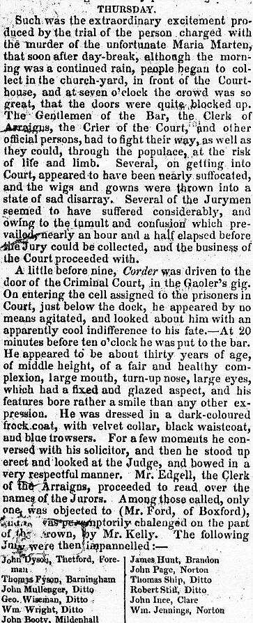 The Assizes were held at Shire Hall, Bury St Edmunds during August 1828. Corder's trial was scheduled for Monday 4th. Even as early as July 21st, the "Times" reported "so great is the anxiety to be present at his trial, the lodging-house and hotel-keepers in Bury are already speaking of an increase in their usual assize prices." Because of the notoriety of the case, immense crowds gathered and the hearing was put off until Thursday 7th. It was announced on the Wednesday evening that women would not be admitted.