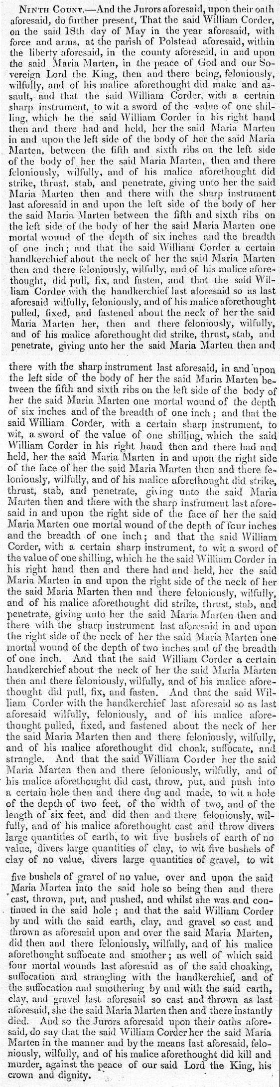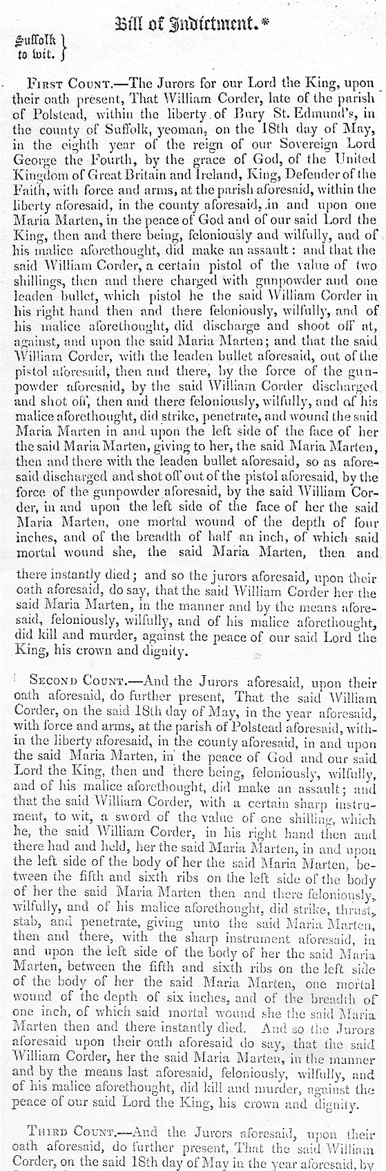 Since the exact cause of death could not be established beyond doubt, The Bill of Indictment, which comprised nine counts, was drawn up to cover all possible causes, singly and in combination. The Prosecution did not intend to let Corder escape on a technicality. The ninth count alone covers over two pages in Curtis. Curtis commented in a footnote that "This indictment is considered as a masterly specimen of legal skill and exactitude, and will, no doubt, become a standard for future reference." [Curtis, (p.111)]. It is said to have been used by Suffolk police for training cadets well into the 20th century.