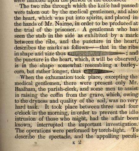 "I am a surgeon, and live at Boxford. I was present when the body was viewed by the gentlemen of the jury, and made as minute an examination as I could. I first took off some pieces of sack which covered it; the body was lying upon its right side, with the head forced down upon the shoulder. There was an appearance of coagulated blood upon the cheek, and there appeared to be blood upon the clothes and handkerchiefs. The green handkerchief round the neck had been pulled tight, so that a man's hand might be put between the knot and the fold, and under it there was the appearance of a wound from a sharp instrument, but that part was so decomposed, I can only say that it had that appearance. The internal bone of the orbit of the right eye was fractured, as if a pointed instrument had been thrust into it, and the bone dividing the nose was displaced; the brain was in such a fluid state, that I am unable to say whether it had sustained any injury or not. Such a stab as I have described might have penetrated the brain. I found no injury in any other part; but there were two small portions of bone in the throat, which might have passed thither from the nose or orbit of the eye. I think the handkerchief was drawn tight enough to have caused death; the neck of the deceased appeared very much compressed indeed. The sack had evidently been tied after the deceased* had been put in head foremost. I had the mouth of the sack in my hand. *In a supplementary deposition since the exhumation of the body, the witness gives it as his decided opinion that a pistol ball entered the neck about the jugular vein, and proceeded, in an oblique direction, to the eye on the opposite side of the head, which would have produced the fracture before alluded to on the orbit. from Curtis, J. 'The Mysterious Murder of Maria Marten' pp. 29-30