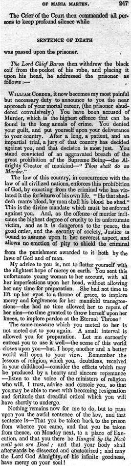 The trial lasted two days. The jury found Corder guilty. He was sentenced to be hanged and anatomised - i.e. the body was to be given to surgeons for medical research. Corder had more or less accepted that he would hang. He was devastated at the thought of being cut up.