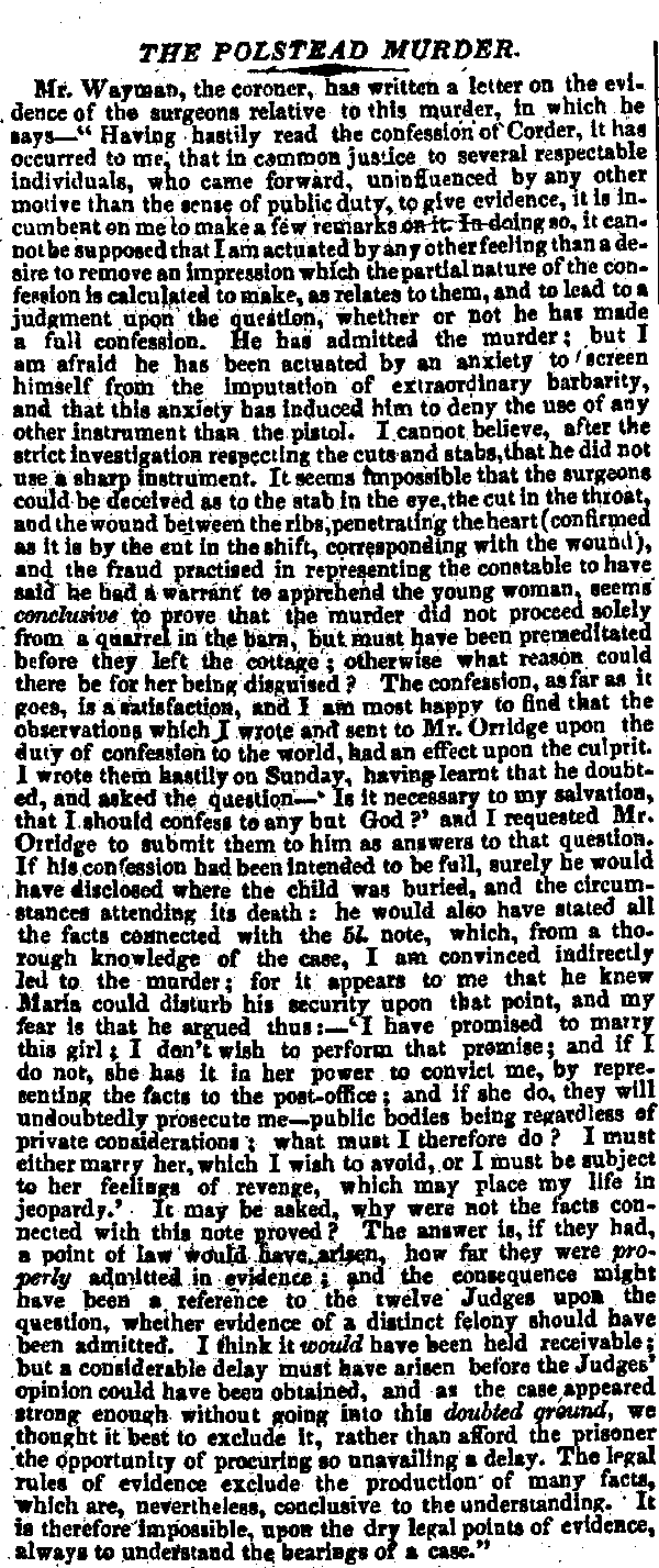 Even after the trial the exact means of Maria's death was under discussion, as the West Suffolk Coroner's letter to the Times of August 20th 1828 illustrates.