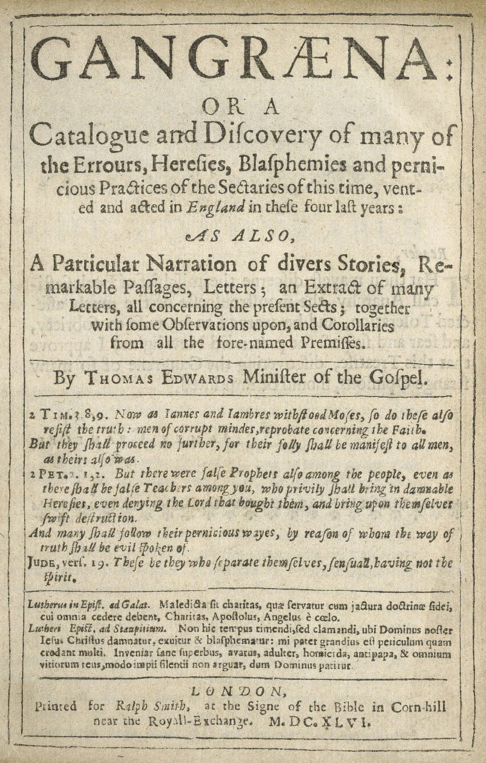 Thomas Edwards (1593-1647) was the most outspoken and persistent Presbyterian opponent of these sects and of religious toleration. He wrote many pamphlets describing and attacking these "Errors, heresies, Blasphemies and pernicious practices", apparently with little regard for the truth of his allegations.