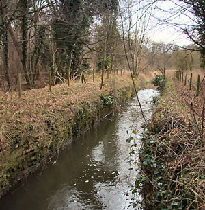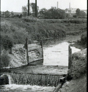 Babwell Clough and David Addy Seen in 1971, this was the view downstream to the remains of structure. Past the brickwork, on the right, is the junction with the diverted stream from the former Mermaid Pits. |