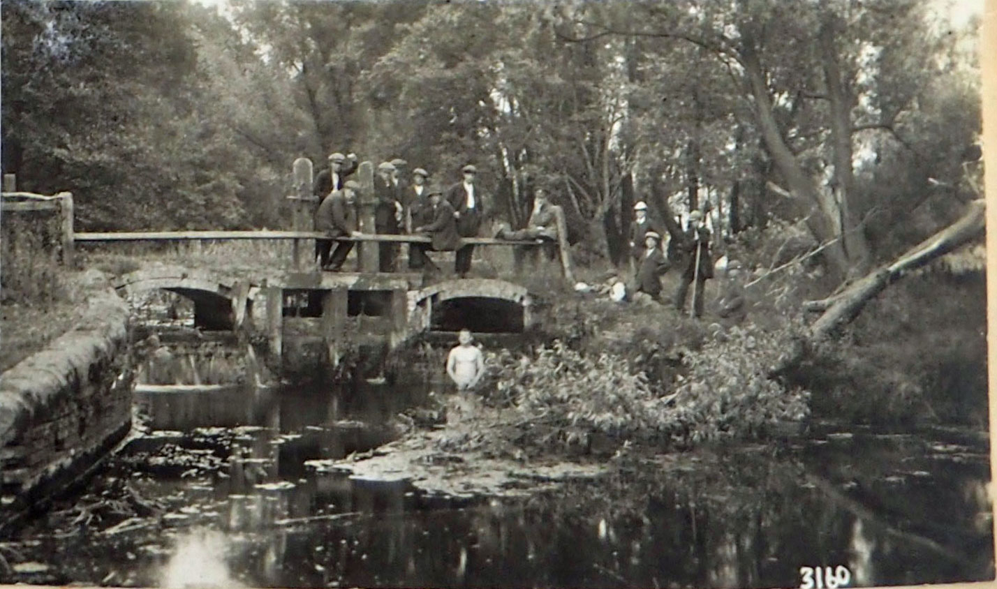 Causeway Bridge Tragedy 1890. This view of the old wooden bridge is looking upstream. Just beyond the bridge would be the site of Fornham Lock. Note the water flowing in from the left, and the brick channels for water management on the right. |