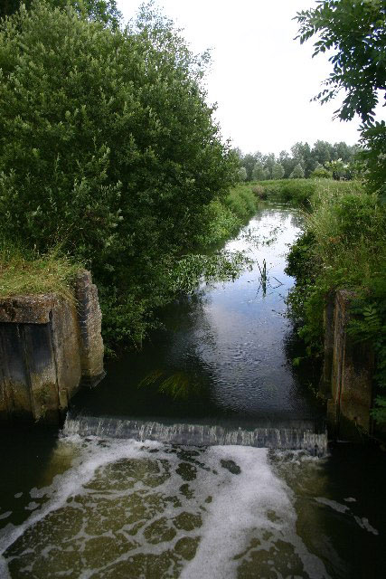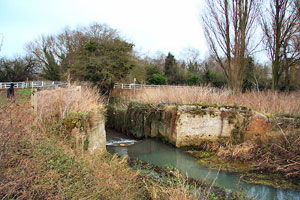 View upstream to the site of Hengrave Lock. These remains of a former lock are viewed from a footbridge over the river, which was formerly open to vehicles in the 1990s. TL 831 690 |