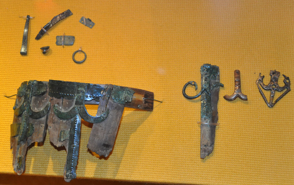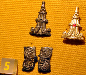 Object 3 is a bronze terminal in the shape of a stylised boar's head from Icklingham. Number 8 is a gilt bronze and garnet belt buckle set from Eriswell. |