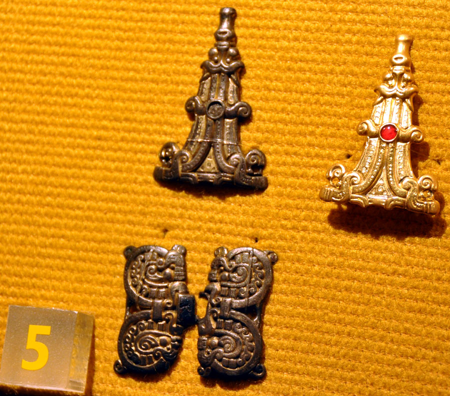 Sleeve fittings from Mildenhall, showing beaked heads in gilded bronze. Also shown is an ornate wrist clasp, all part of a set. |