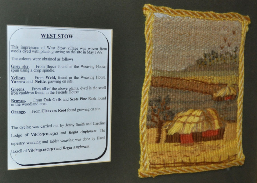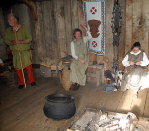 Re-enactors wearing dyed clothes as probably worn by higher status individuals within the village. The lady in the centre is spinning yarn using a spindle. This view is from inside one of the reconstructed houses. |