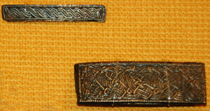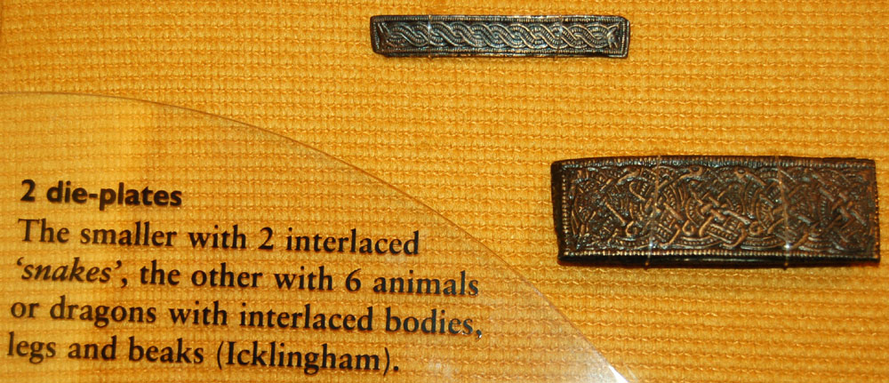Two metal dieplates from Icklingham. The larger has 6 dragons with interlaced bodies, legs and beaks. The smaller has two interlaced snakes. |
