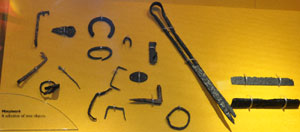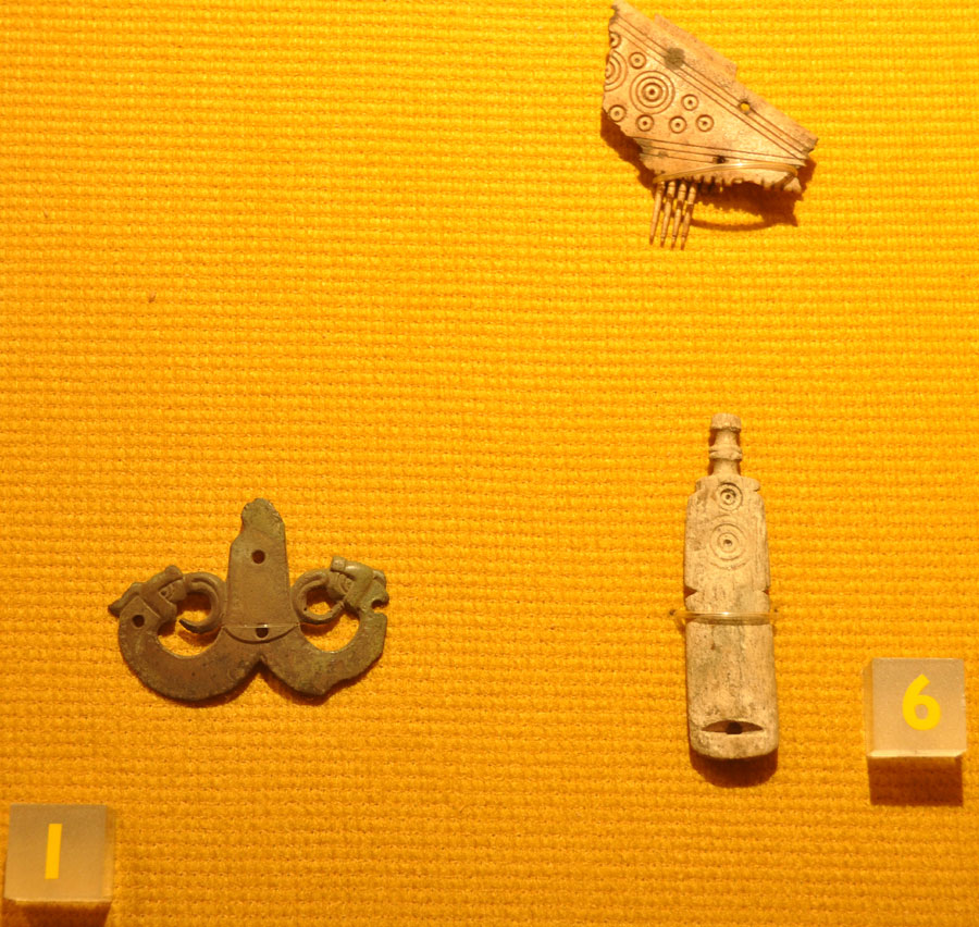 A bucket mount from West Stow cemetery, and a toy bone whistle from Bury St Edmunds. The bucket mount has two in-turned beaked heads, a common motif at this time. |