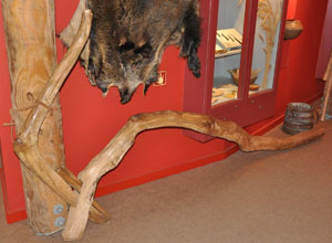Reconstruction of an early Anglo-Saxon plough. A short iron blade gave added life to the implement. Spelt wheat, barley, rye and bread wheat were all cultivated. Vegetables were raised, along with hens and pigs. Sheep were kept on the drier slopes, and cattle reared in the damp water meadows by the river. Horses, goats, dogs and cats also shared their lives, but there was no evidence of rats. |
