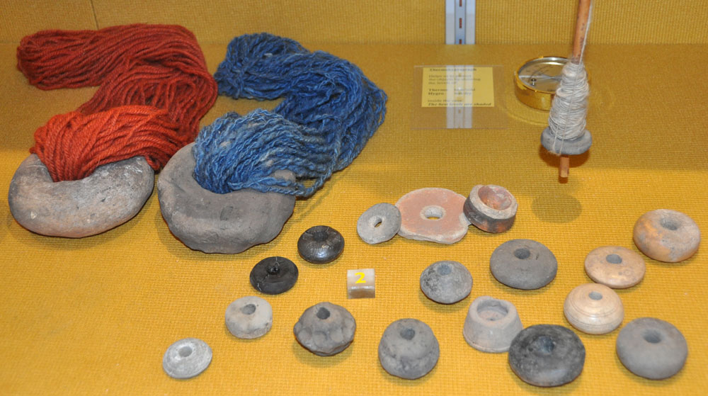 West Stow villagers had to clothe themselves as well as feed themselves. Weaving looms were in use, as shown by the loom weights found in several buildings. Two loom weights are illustrated here. Also these spindle whorls show that raw wool was spun into yarn by hand before weaving could take place. |