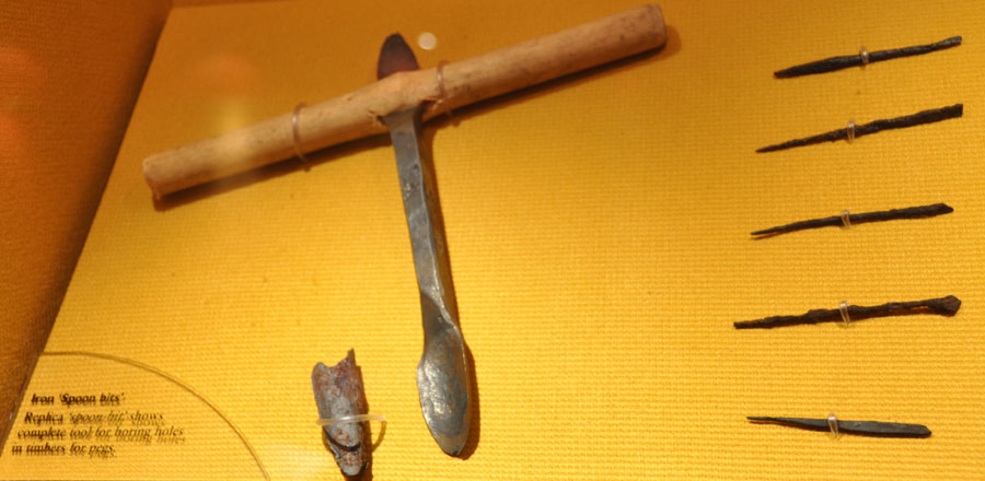 This picture shows the remains of an iron spoon-bit. A reconstruction shown here illustrates how it originally looked. It was used to bore holes in timbers as part of the building of a house or other woodwork. |