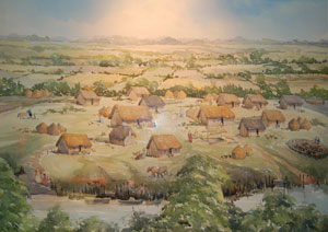 This painting of the Village and its setting, as it might have been around 550 AD, hangs in the Centre exhibition area. Painted by Jackie Cotton. |