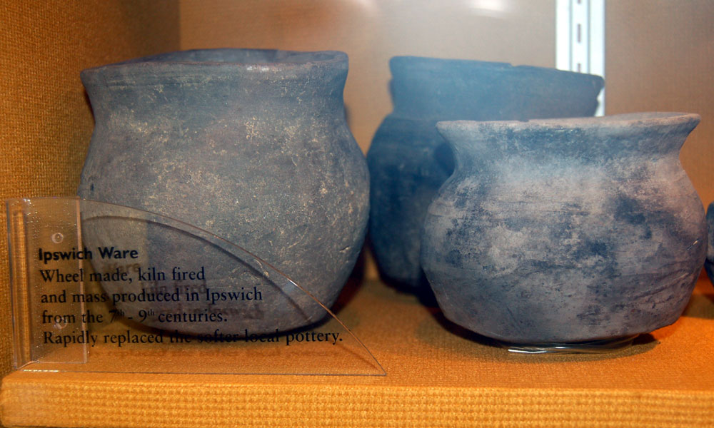 Ipswich ware pottery found at West Stow. This pottery was mass produced on a wheel by pottery workshops in Ipswich. It quickly replaced the cruder pottery made locally at West Stow and other potteries. It had been thought to date from about 650 AD onwards, and represented the most recent objects found in the West Stow excavations. From this evidence it was concluded that this was the abandonment date for West Stow. Recent speculation has placed the start of Ipswich ware to perhaps 700 to 730, and if this becomes accepted, it gives West Stow village a further 50 to 80 years of life beyond what had been thought. |