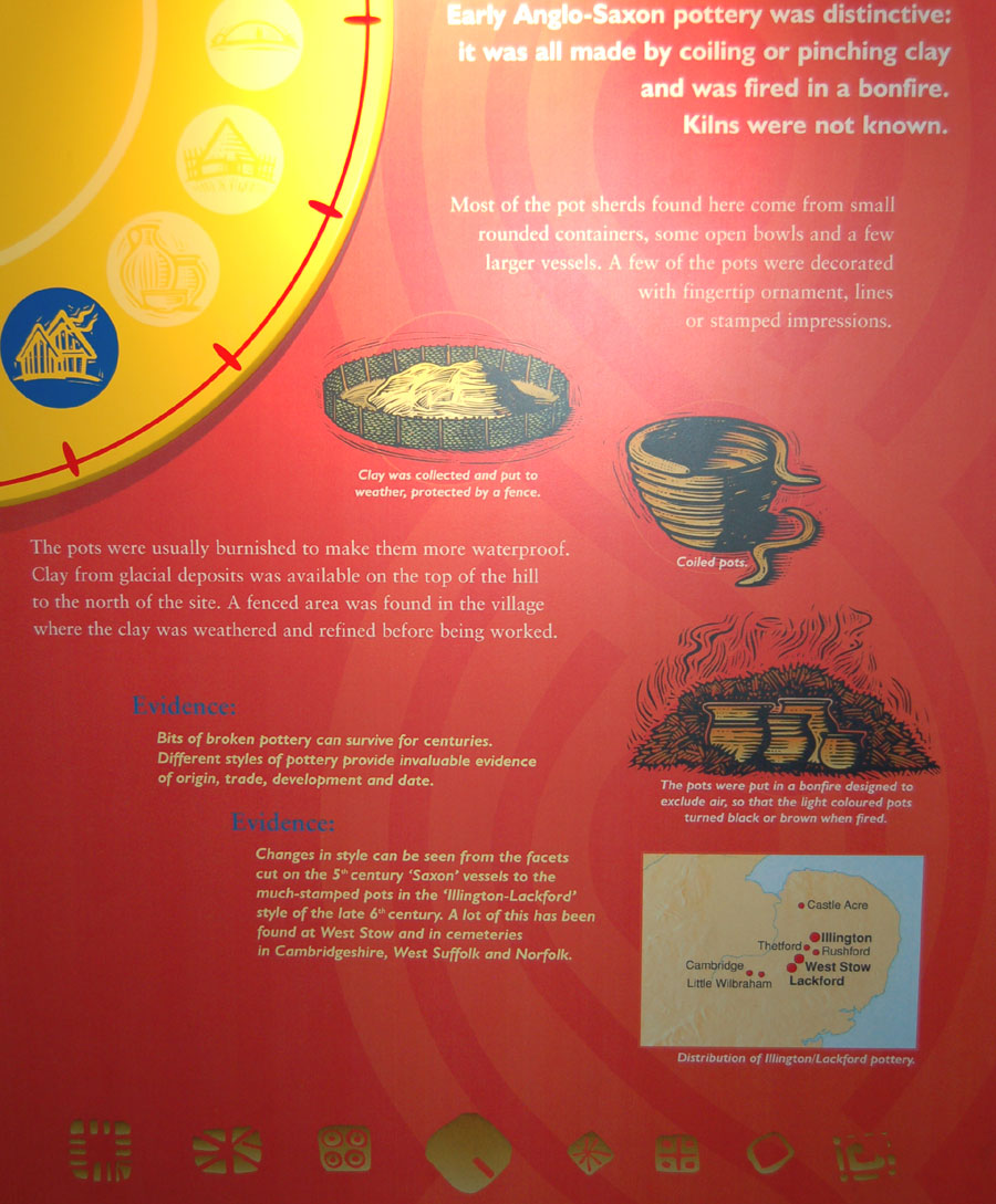 Display Board showing how local clay was gathered, how pots were made, and then fired in bonfires at West Stow. |