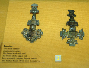 Two animal headed cruciform brooches from West Stow cemetery, dated to the 6th century. The horse head ends seem to have also been given human masks and beaked heads. |