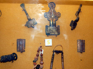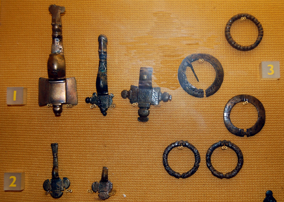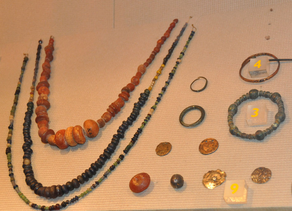 West Stow Cemetery beads. Object 3 is an annular brooch in cast bronze. 4 is a bronze bracelet. 9 is two silver pendants. |
