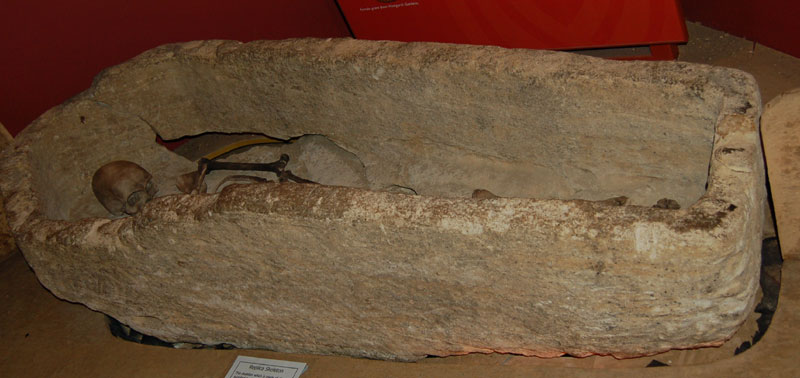 Coffin made from Barnack limestone. This was found in the cemetery across the road from the village site. However, it was probably removed from the Romano-British cemetery in the nearby village of Lackford, in order for it to be used for the body of an important man at West Stow. (The skeleton is a clay reproduction.) |