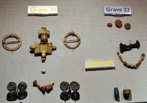 Grave goods from the male burial in grave number 22 excavated at Westgarth gardens in Bury St Edmunds. Also grave 18 and 33 from ??? |