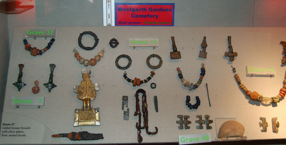 Grave goods from the female burials in graves numbered 7, 13, 16, 27, 31 and 48 excavated at Westgarth gardens in Bury St Edmunds. This cemetery was excavated during 1972 and so modern recording methods were used, and the objects retained intact by the site owners. |