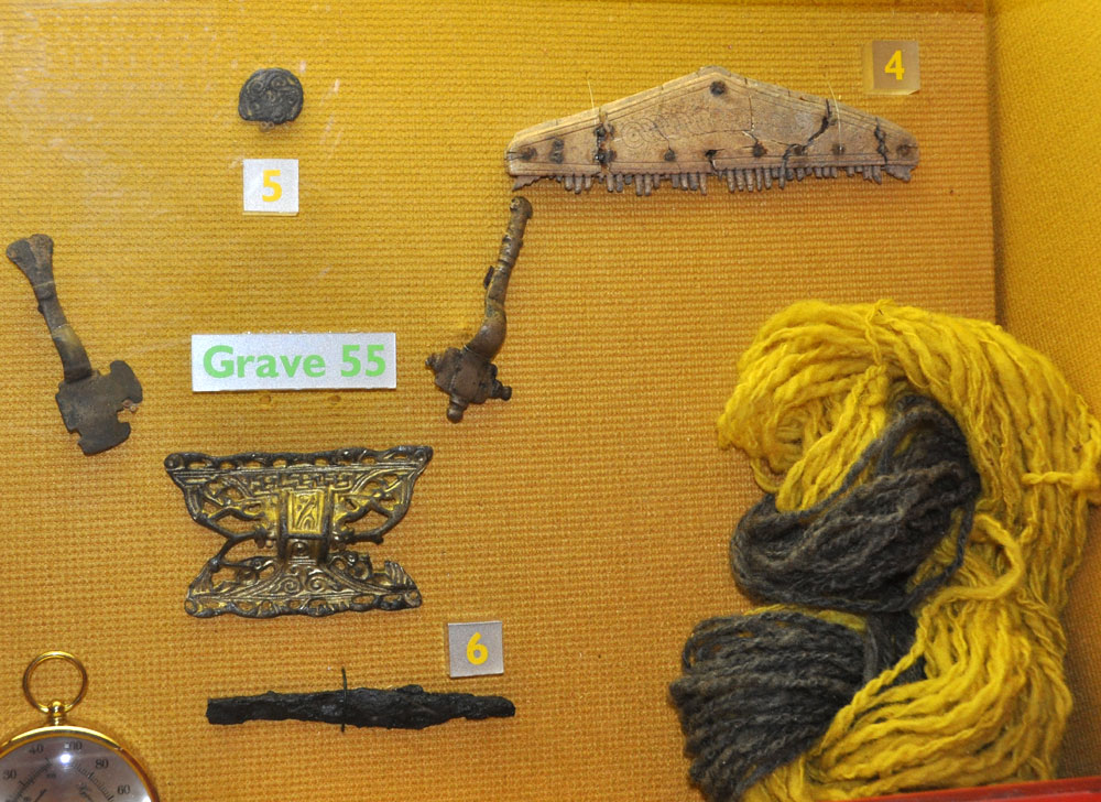 Grave goods from female burials, including grave 55 from Westgarth Gardens, showing 5th century objects. These include bronze brooches, buckles and a bone comb. |