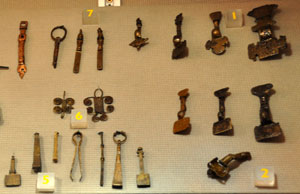 West Stow Cemetery spearheads and bone items. These were excavated during the 19th century and exact details of graves etc do not exist. 11 is a bone comb case and 12 is a bone needle, two weaving pins and a bone handle. |