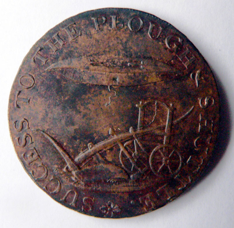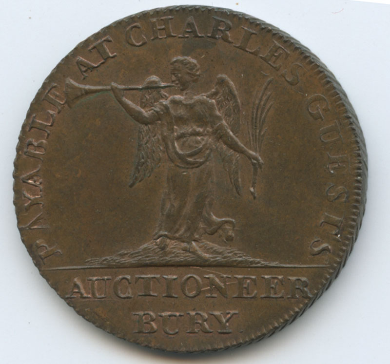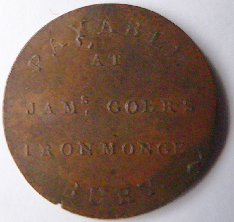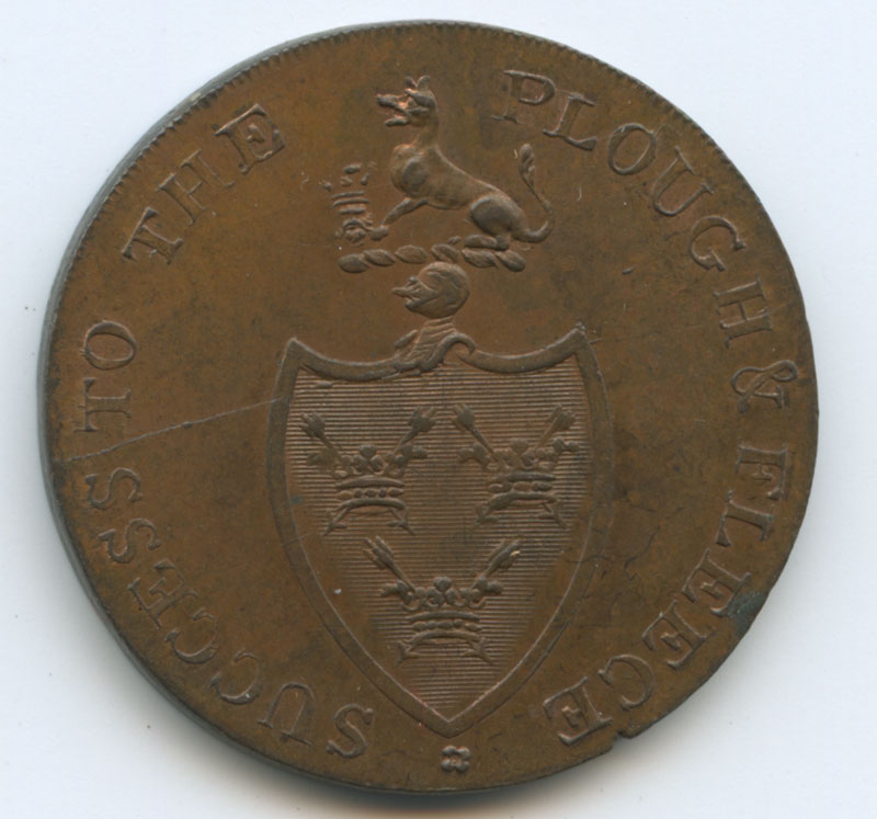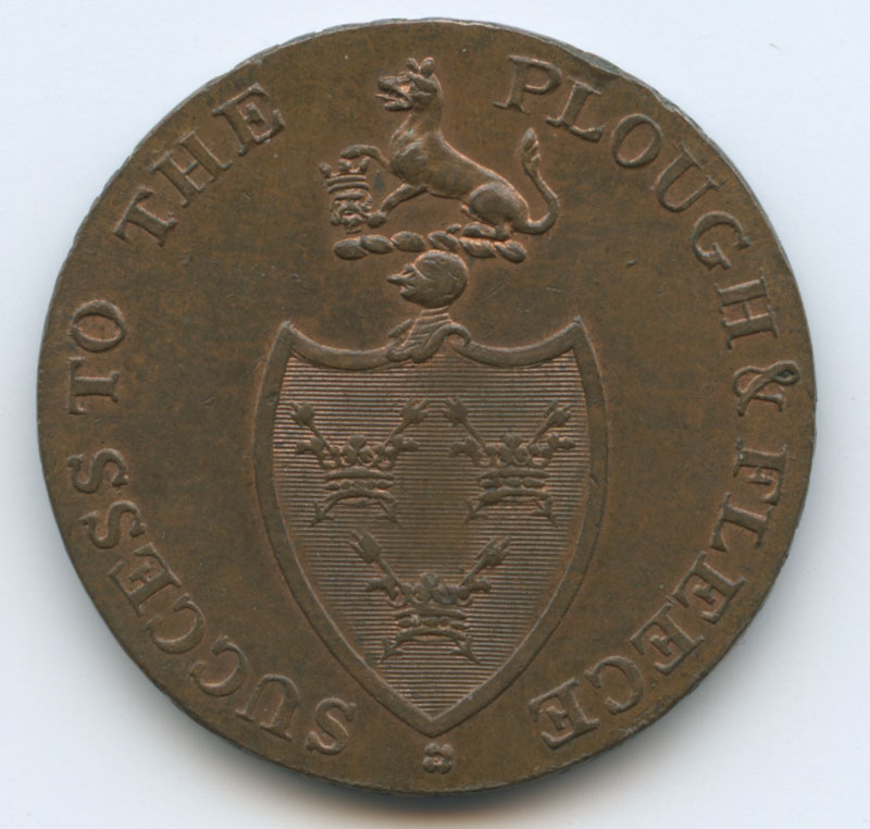 This face showing Bury's arms and this motto, "Success to the Plough and Fleece", also appears on other Bury tokens |