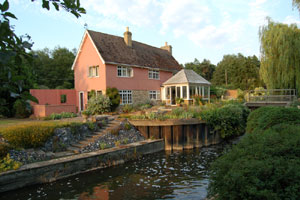 Fullers Mill, West Stow The Domesday Book recorded two mills at West Stow, according to Gransden. My copy does not confirm this. However, one of Abbot Samson's leases dated between 1200 and 1211, refers to "our two mills (at West Stow) which pertain to the scriptorium of the church of St Edmund". Also, by 1540, the sales particulars of West Stow manor included a water mill and a fulling mill. At this date the manor was purchased by Sir John Crofts. Fulling was a process carried out on woollen cloth to clean and thicken it. The cloth had to be soaked in a bath of water and fuller's earth or urine, to first remove the grease. It was then beaten with mallets and repeatedly smoothed. Since the 13th century, the beating had been carried out by water power raising and releasing the heavy wooden mallets. It was then washed in clear water to remove the effects of the process. The Ingham Local History Group found a lease dated 1458 for Charmans Farm at Risby. The lease excluded "the fulling mill at West Stow called Formylle...". Similarly in 1461 a deed in the Suffolk Record Office described Thomas Grought as a fuller of West Stow. In 1823 it was a "neat cottage" occupied by Mrs Palmer. In 1841 the 75 year old John Johnson, still referred to as a miller, lived there with a servant. The fullers mill was thought to be located on the opposite side of the river to the cottage. It stood on a narrow bank above its millpond. The pond is still visible as part of the gardens. The cottage dated originally to the 1650s, and has largely been replaced by the modern house, with a magnificent garden open to the public every month during the season. It is home to Bernard Tickner, the garden's creator, but the greater part of the gardens are now managed by the Fullers Mill Trust. The Fullers Mill Trust website is at www.fullersmillgarden.org.uk