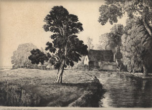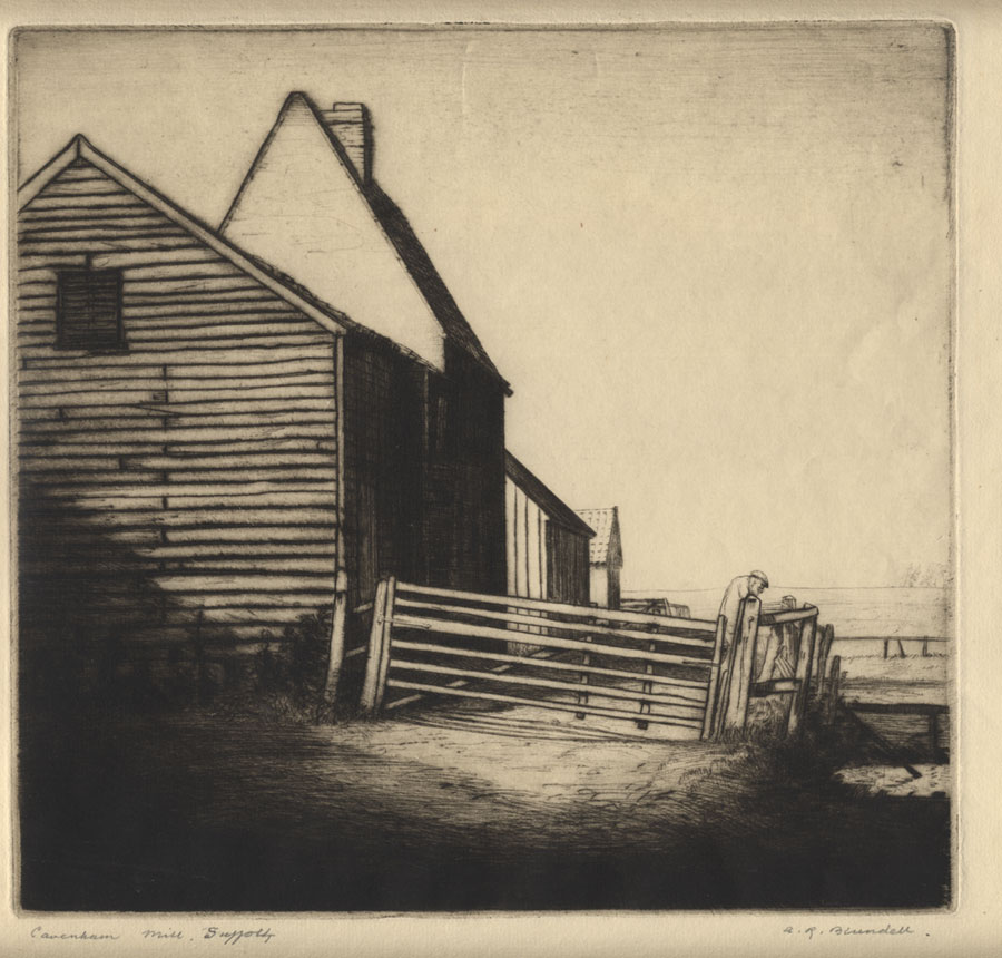 This drypoint by Alfred Blundell appeared on EBay in 2010, entitled Cavenham Mill. The view is rather odd, but adds something to our knowledge of this mill. Unfortunately the date is currently unknown. I believe that another view of this mill was drawn by Blundell, and possibly the miller's portrait was made in drypoint as well. |