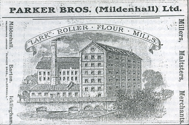 Mildenhall Mills - Lark Mill This mill is recorded in the Domesday Book, and dates back to before 1066. In 1722 there was a dispute between Mr Ralph at Mildenhall Mill, and Henry Ashley, the owner of the Navigation rights on the River Lark. Ralph seems to have had a string of grievances, but he was now threatening to pull up the Mildenhall Lower Staunch. He felt that he was not getting enough water to drive his mill. Ashley had avoided such disputes at Icklingham by buying the mill himself, and at Chimney Mills by taking on a long lease. Lark Mill had steam power introduced in 1868, and some time later the water wheel was replaced by water turbines. In 1887 the old wooden Lark mill was replaced by the large steam and water driven roller mill illustrated here. Roy Silverlock noted that it was reported as "the most important event in the locality", in Simpson's Retrospect for 1887. Simpson was a Mildenhall printer and publisher. By 1890 it was called the Lark Roller Mills, run by Mr Owers, who retired in 1897. In 1897 Lark Mills were taken over by Parker Brothers, who already kept the mill at Barton Mills, and would remain with that family until the late 20th century. In November, 1901 the expanding firm of Parker Brothers re-opened the Mildenhall Mill. The River Lark Navigation and all its rights were finally sold to Parker Brothers of Mildenhall, on July 30th, 1902. From 1919 to 1936 a dynamo driven by Parkers' mill supplied electricity to parts of Mildenhall.
