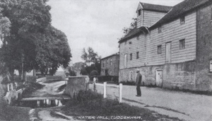 Tuddenham Mill This mill was mentioned in the Domesday Book, (28.3), as part of the holdings of Eudo the Steward, where a freeman called Canute held a manor. Tuddenham Mill stands on the Tuddenham millstream, which flows into the River Lark about a mile away. The mill is at the northern end of Tuddenham St Mary village, on a road which was once a main route from Norwich to London, via the Temple Bridge at Icklingham. The present mill was built in 1775, by Collins, millwrights of Melton. It had three pairs of millstones. By 1844 the mill had installed a steam engine for auxiliary power. In 1890 the Tuddenham Mill Stream had been dredged to allow navigation up to Tuddenham Mill. This work had required a new staunch to be installed on the mill stream. The millstream was made navigable as part of Lord Bristol's attempt to revive the Lark navigation, but the venture failed within a few years. In 1920 the artist Alfred Blundell took up residence, until his death in 1968. The mill worked until the 1950s. It was used for storage until 1973, when this mill was converted into a restaurant. The internal waterwheel has been retained. |