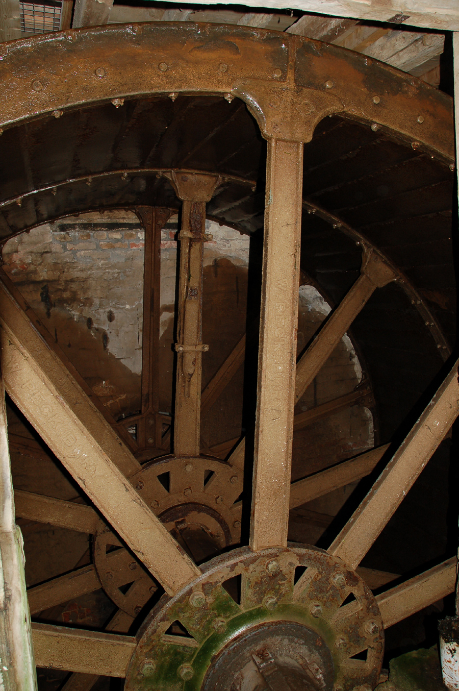 Pakenham Water wheel is 16 feet high, and is the source of the mill's power. Each spoke bears the impress 'W PECK BURY'. This cast iron wheel was originally designed by Walter Peck, millwright of Sparhawk Street, Bury St Edmunds, and cast at Cornish and Lloyd's foundry in Risbygate Street, Bury, in 1898. |