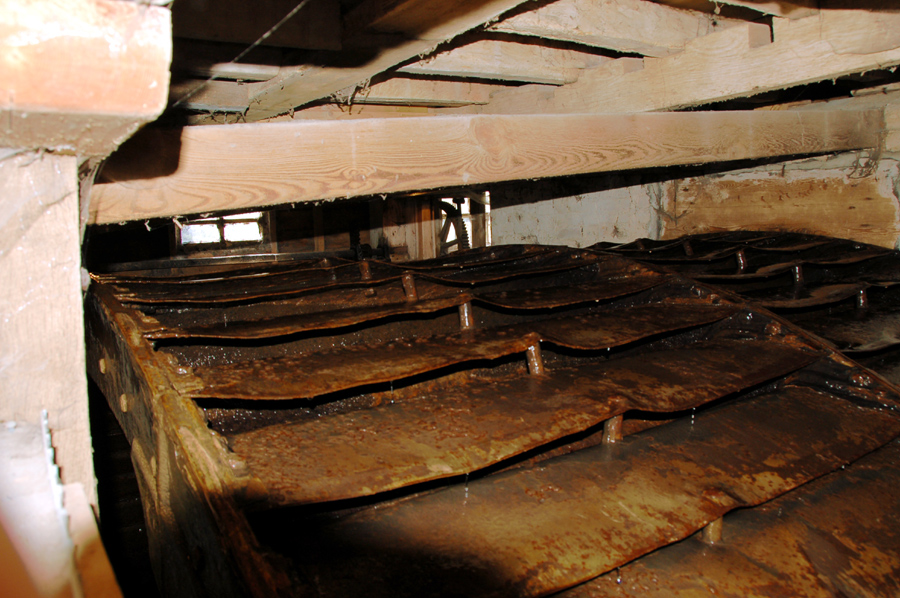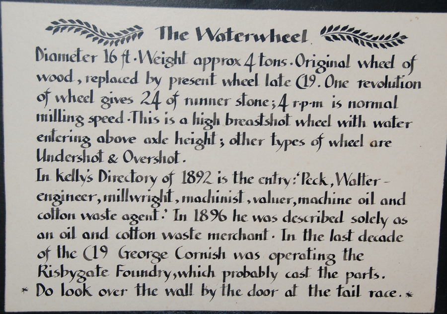 Pakenham Information Board 5 Details of controlling water supply to the wheel, which is a "breasthot" wheel. Before 1814 the wheel was the inefficient undershot design. In 1814 Charles Lowe installed this new design, and had to build up the banks of the mill pond to raise the water level to the right height. The 1814 wheel was made of wood and iron, and needed replacing by 1898. |